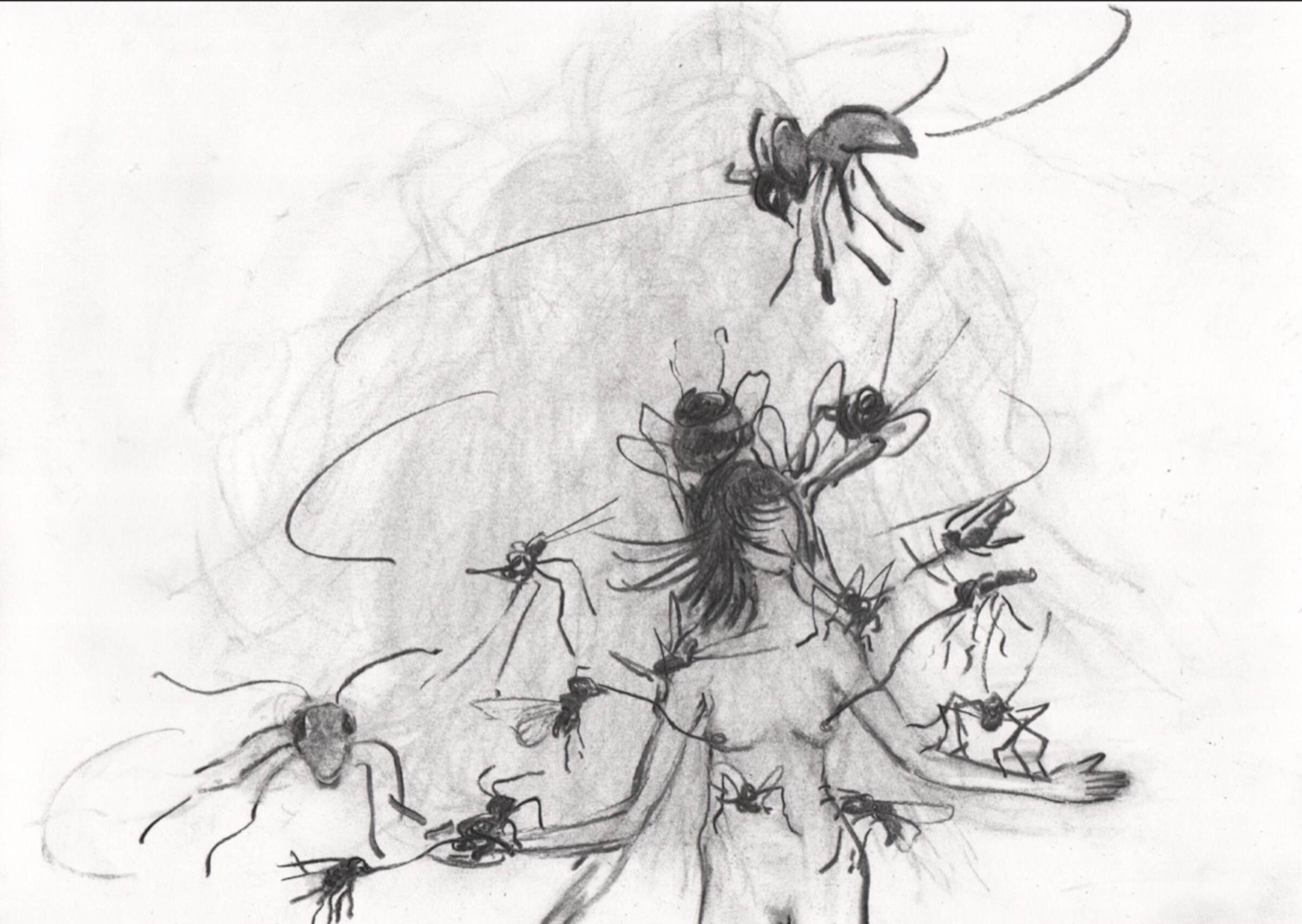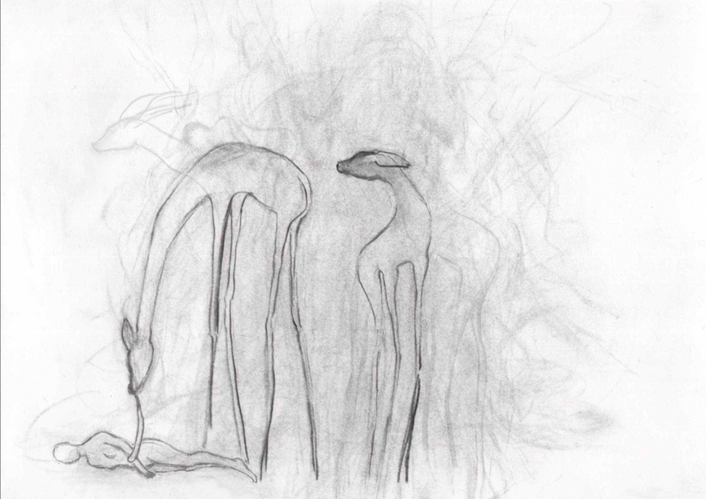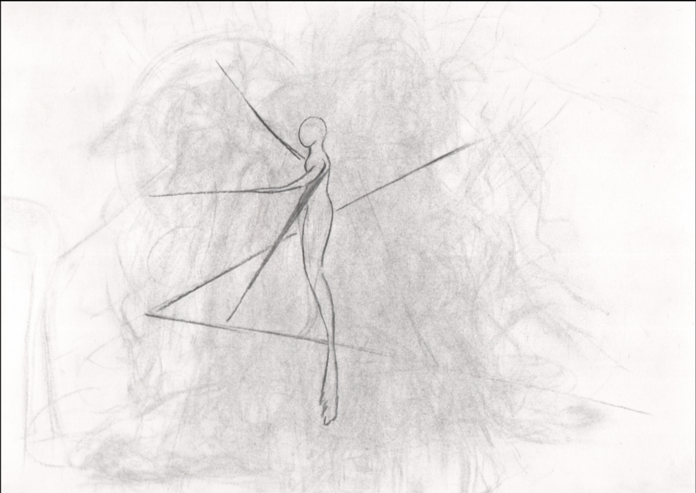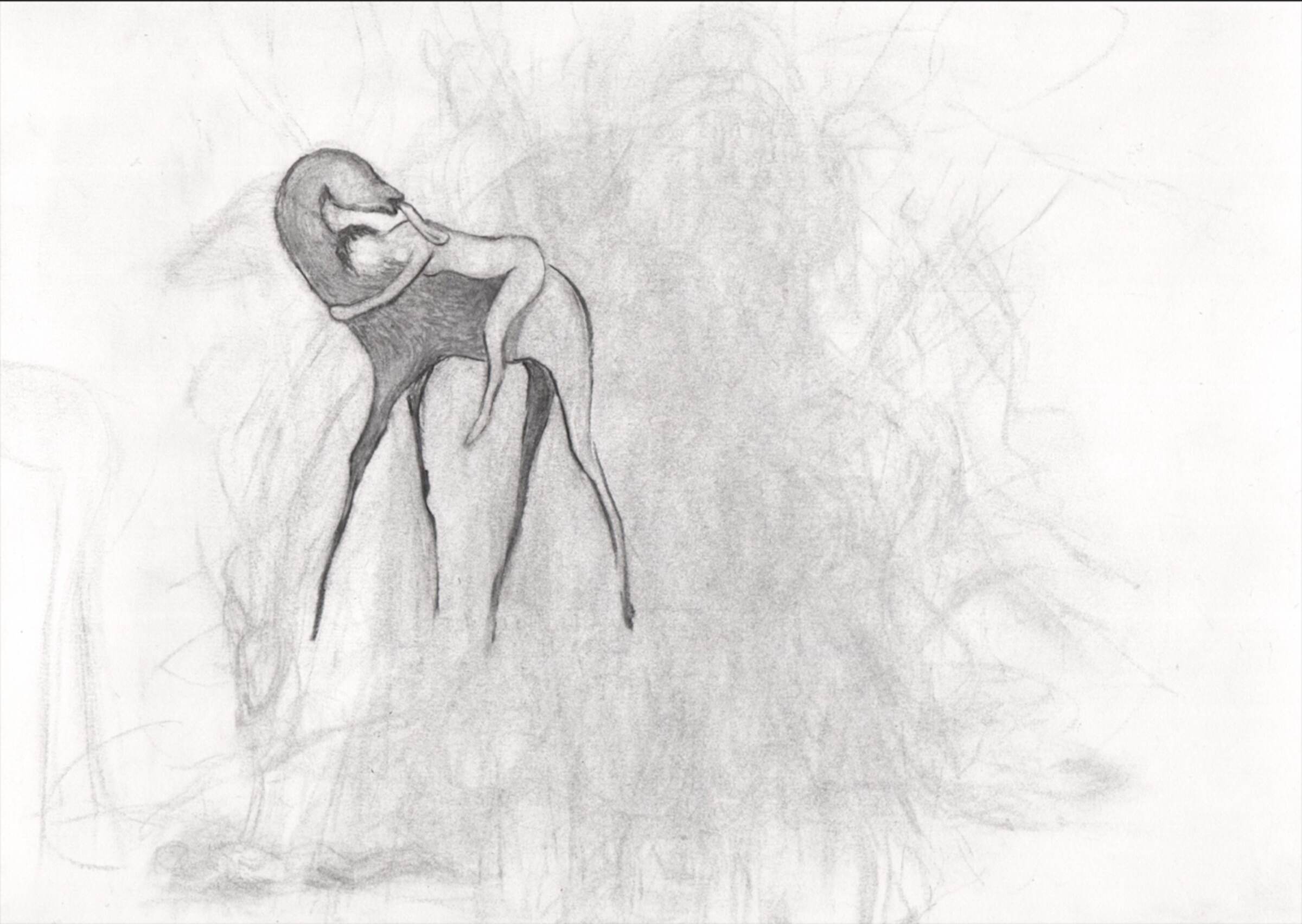 Bewegte, sich stetig verwandelnde Zeichnungsspuren, aus denen amorphe Wesen, Pflanzenfragmente und wundersame Formen auftauchen, um sogleich wieder zu verschwinden oder sich in neuen Konstrellationen aufzulösen, treten in Beziehung mit einem im Raum schwebenden Körper, der im Werden begriffen zu sein scheint. Eine schützende Hülle umgiebt ihn, einer Fruchtblase oder Samenkapsel gleich. Lichtfunken in Regenbogenfarben und Spiegelungen von Lichtquellen ausserhalb des Dienstraums versetzen den luftigen Körper in Bewegung und verändern sein Aussehen fortwährend. Der Tanz flüchtiger Begegnungen im Fluss konstanter Veränderung lässt potentielle Realitäten und Möglichkeiten erahnen und Grenzen immaginär überschreiten.